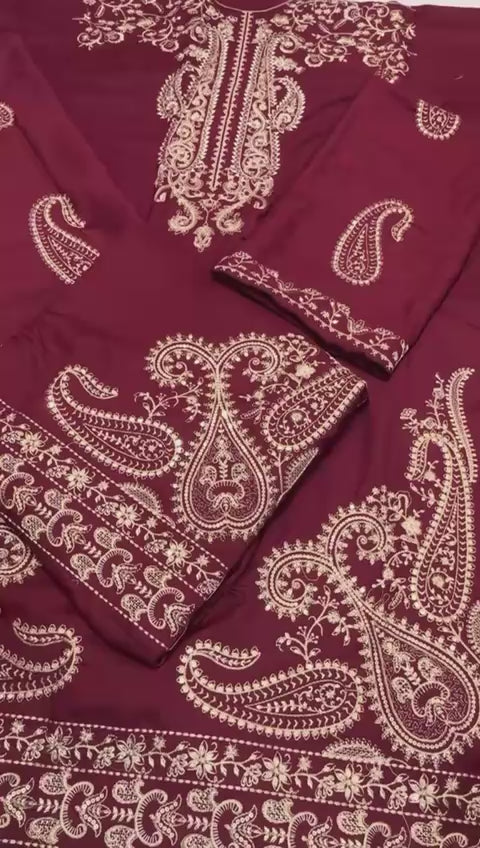 Stunning Maroon Asim Jofa 2-piece dress featuring full heavy embroidery on front, sleeves, and back, with a beautifully designed short boti for an elegant touch. Paired with a simple plane trouser and premium danak wool shawl, this outfit is ready-to-wear for parties, weddings, and festive occasions. Rich color, designer embroidery, and luxurious fabric make it a must-have for every fashion-forward wardrobe.”