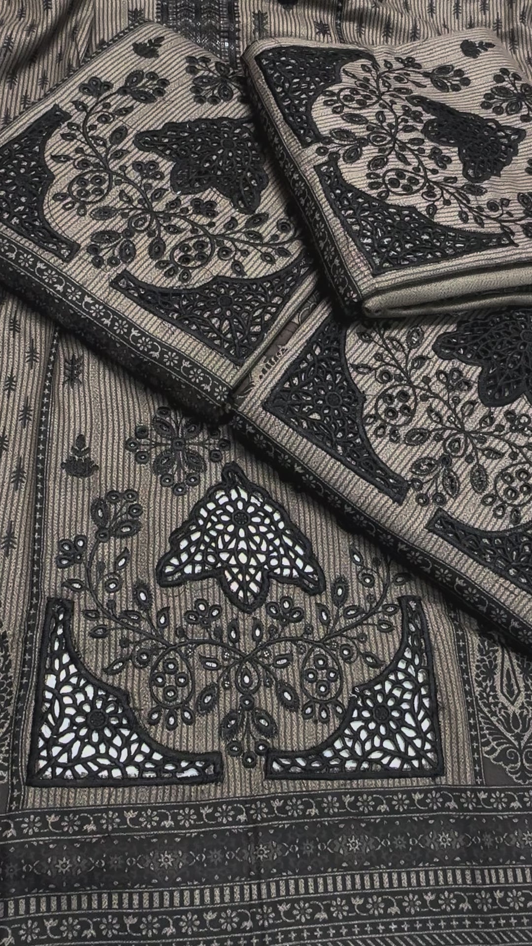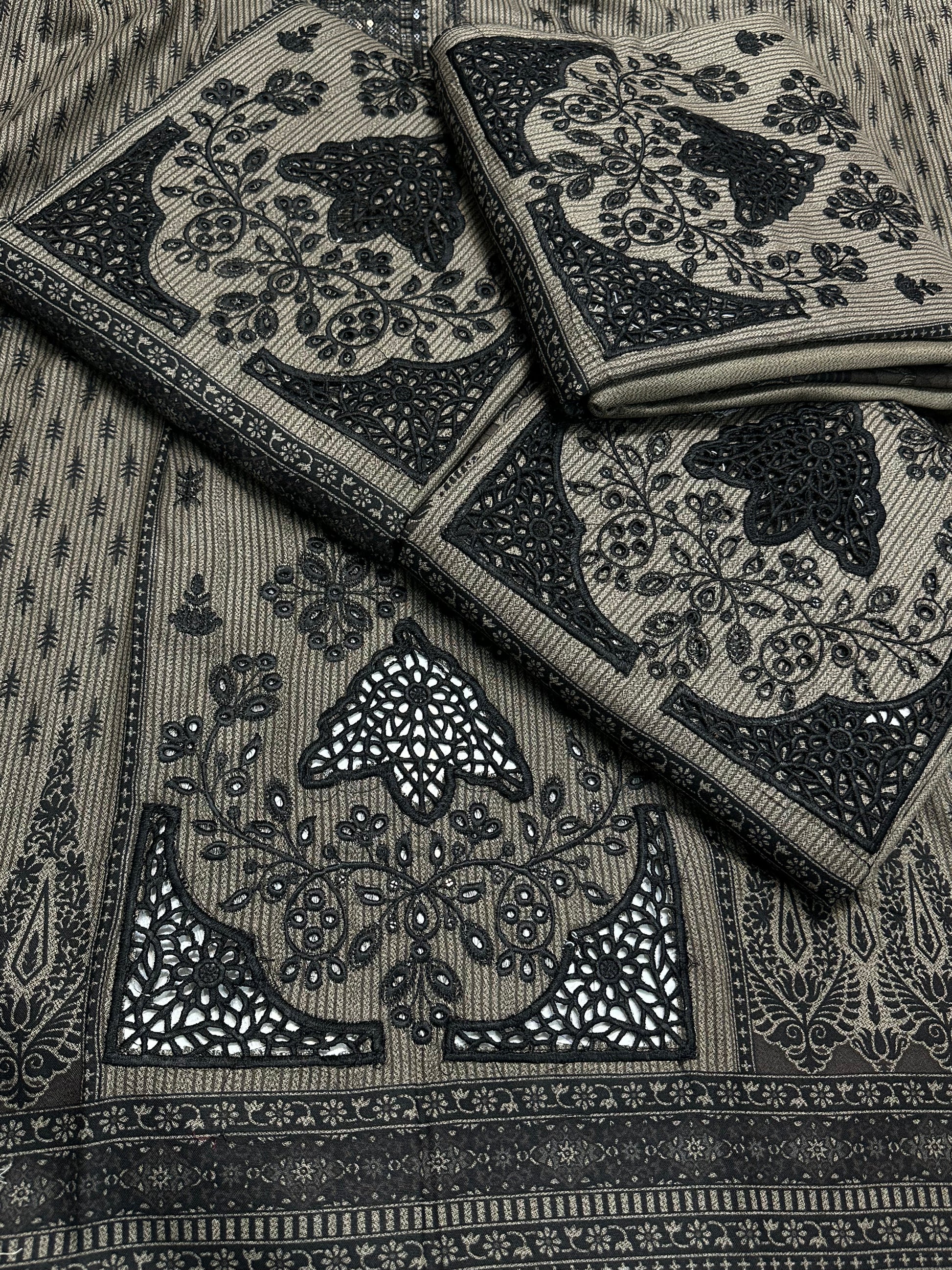- Elevate your wardrobe with this stunning Danak 3-piece ensemble in soft taupe/beige hues. The front daman showcases exquisite black leisurekari embroidery, complemented perfectly by a signature Danak printed shawl for a complete, timeless look.