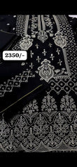 This striking black lawn suit features detailed silver embroidery, creating a beautiful contrast that exudes elegance. The intricate designs, including floral patterns and geometric shapes, are carefully crafted to enhance the overall look. Perfect for formal or semi-formal occasions, this suit provides a sophisticated yet contemporary appearance, offering both comfort and style.