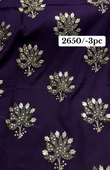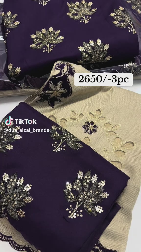 A rich amethyst-toned ensemble adorned with intricate golden floral buti embroidery that exudes timeless elegance. The deep hue enhances the detailed craftsmanship, giving it a graceful royal appearance. Perfect for festive occasions, evening gatherings, and formal wear — effortlessly refined and beautifully classic.