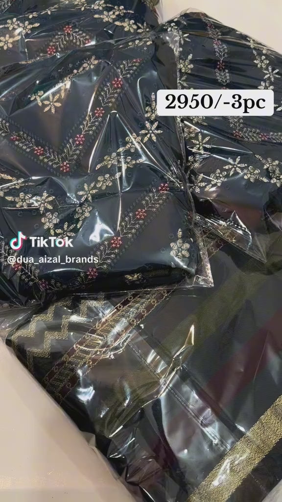 A sophisticated indigo ensemble detailed with blooming floral embroidery in soft ivory and delicate red tones. The graceful V-pattern enhances its elegant fall, creating a refined and festive aura. Perfect for mehndi, receptions, family gatherings, or evening events—this design promises both comfort and timeless charm.