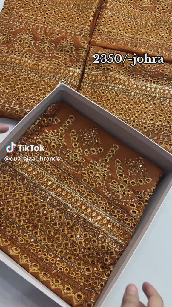 A warm and radiant orange ensemble from the Johra collection, featuring exquisite mirror and thread embroidery that adds depth and shimmer. The intricate border detailing enhances its luxurious appeal, making it a perfect choice for festive occasions and traditional gatherings. Crafted with fine-quality fabric for all-day comfort and grace.