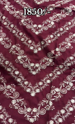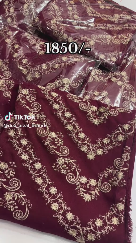 A graceful plum-toned ensemble adorned with soft ivory floral embroidery arranged in beautifully flowing V-patterns. The subtle contrast enhances elegance, making it perfect for daytime functions, mehndi events, and festive gatherings. Lightweight, refined, and effortlessly stylish — a timeless choice for every wardrobe.