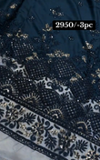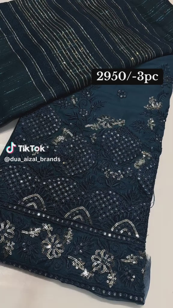 An enchanting deep blue ensemble featuring intricate metallic embroidery and sequin work that glimmers with every move. The rich shade and ornate craftsmanship exude luxury, making it a perfect choice for evening wear and festive occasions. Its refined texture and graceful finish bring an aura of timeless elegance.
