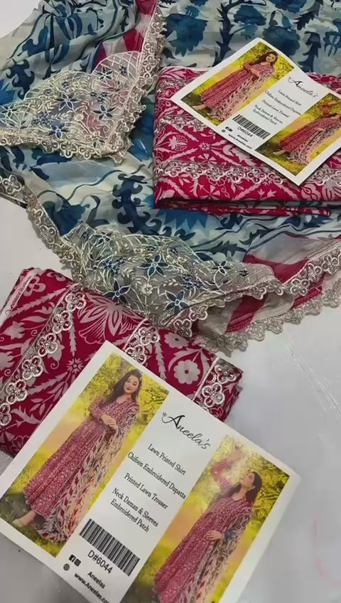 Suit Composition: The set includes a printed lawn shirt, a printed lawn trouser, and a chiffon embroidered dupatta.