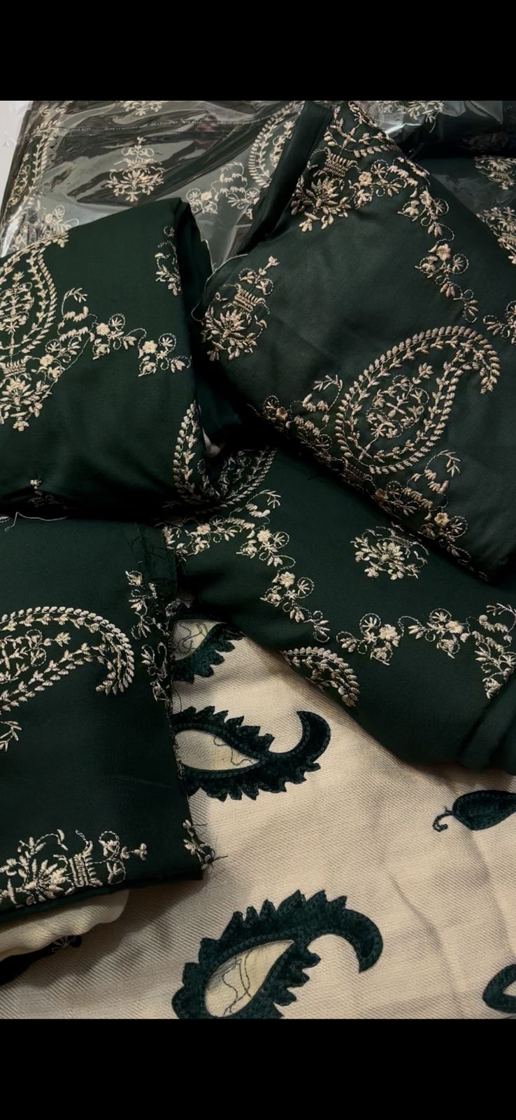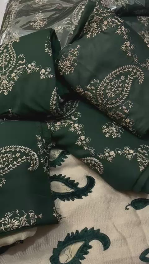 Stay stylish and cozy this winter with the Green Breeze 3-piece dress, featuring rich danak wool fabric for warmth and comfort. The dress showcases exquisite breeze carry embroidery that adds a delicate touch, while the pashmina wool leisure cut appliqué shawl provides both luxury and elegance. Ideal for winter events, weddings, or evening parties, this outfit blends modern design with timeless elegance, making it a must-have for your seasonal wardrobe. Perfect for those who want to make a statement while staying warm!”