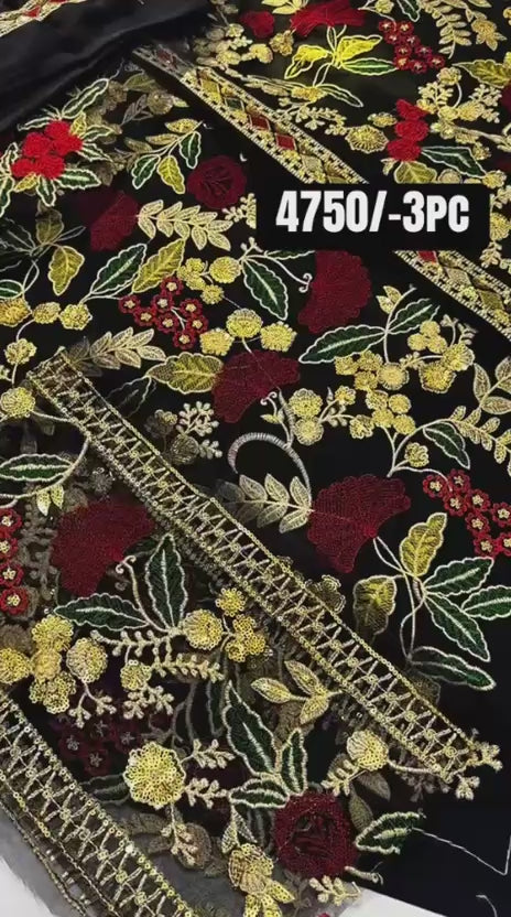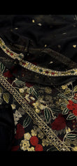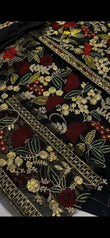 This exquisite black fabric is beautifully adorned with intricate gold threadwork and rich floral embroidery, creating a bold yet elegant statement. The detailed borders and fine embellishments enhance its regal charm, making it ideal for premium formal and festive wear.