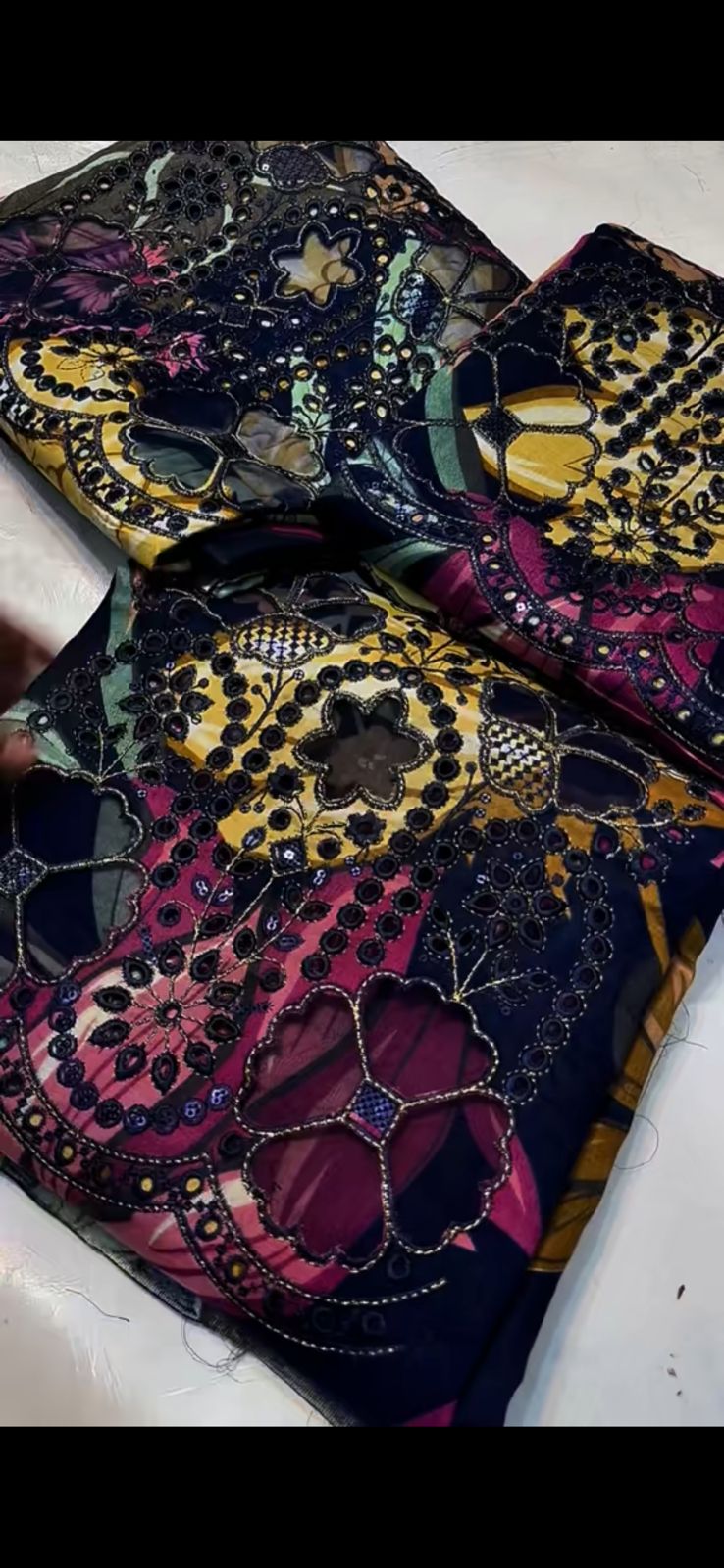This stunning fabric features a mix of bold, colorful flowers with intricate sequin detailing, making it perfect for creating high-fashion ethnic wear. The rich color palette and luxurious embroidery make this fabric ideal for formal events and festive celebrations.