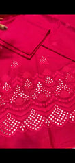 Step into elegance with this stunning ruby pink lawn ensemble, beautifully enhanced with intricate cutwork embroidery and delicate floral detailing. The finely crafted border adds a graceful finish, making it perfect for festive gatherings, summer events, and semi-formal wear. Lightweight yet richly designed, this outfit blends comfort with sophistication for a timeless look.