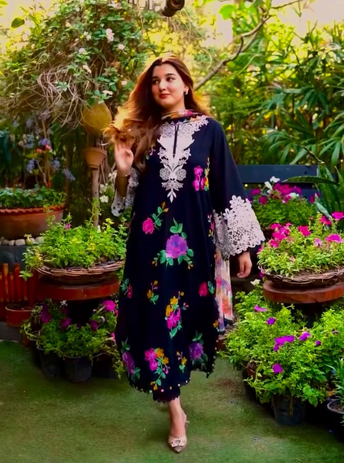 This stunning floral embroidered tunic is perfect for a vibrant, fresh look. The intricate floral detailing combined with lace-trimmed sleeves creates a cheerful and elegant design, ideal for casual outings or semi-formal gatherings.