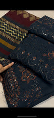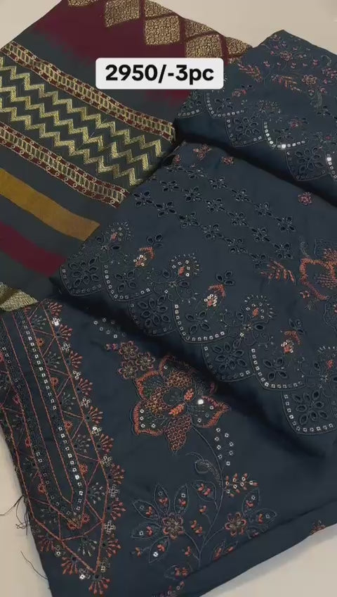 Elegant zinc color 3-piece dress featuring a beautifully crafted chicken kari front daman and a heavy embroidered neckline. The outfit comes with a stylish plain trouser and a premium 4D jacquard shawl, making it a perfect choice for formal and semi-formal occasions. Soft color, classy embroidery and luxurious shawl give this dress a truly timeless look.”